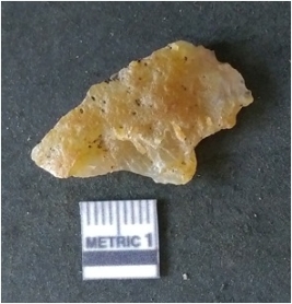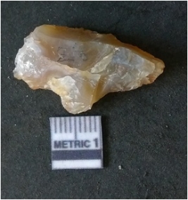 | Description / विवरण | It is chalcedony flake, translucent in appearance. The piece shows sharp pointed ends and flake scars on the surface as a result of flaking. The piece shows a bulb of percussion. |