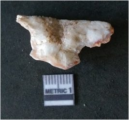 | Description / विवरण | The quartz flake has sharp flaked edges and pointed ends as a result of flaking. The piece is semi-transparent in nature with irregular fracture pattern. The piece is roughly triangular in shape and has a prominent bulb of percussion. |