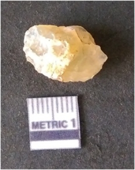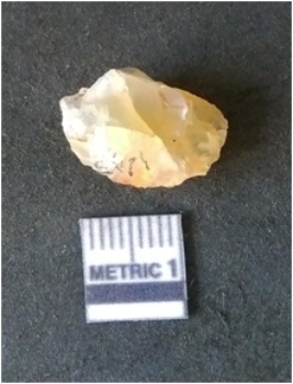 | Description / विवरण | It is chalcedony flake, translucent in appearance. The piece shows sharp pointed ends and flake scars on the surface as a result of flaking. The piece shows a bulb of percussion. |