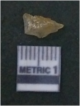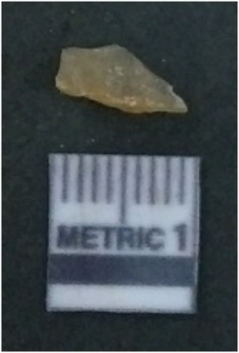 | Description / विवरण | It is chalcedony flake, translucent in appearance. The piece shows sharp pointed ends and flake scars on the surface as a result of flaking. The piece shows a bulb of percussion. |