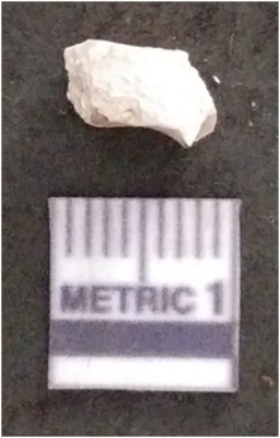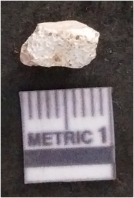 | Description / विवरण | The quartz flake has sharp flaked edges and pointed ends as a result of flaking. The piece is semi-transparent in nature with irregular fracture pattern. The piece is roughly triangular in shape and has a prominent bulb of percussion. |