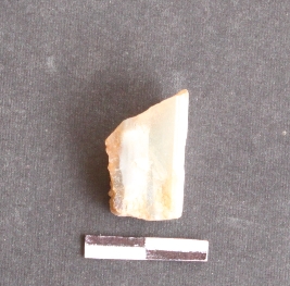 | Description / विवरण | A fragment of quartz with cortex, bulb of percussion seen, flaked. Rectangular with one corner elongated and tapered at the end. |