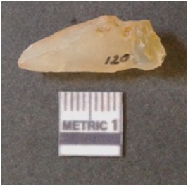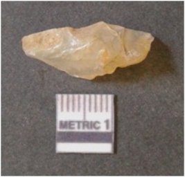 | Description / विवरण | It is chalcedony flake, translucent in appearance. The piece shows sharp pointed ends and flake scars on the surface as a result of flaking. The piece shows a bulb of percussion. |