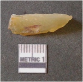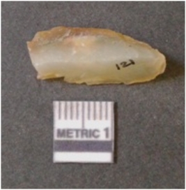 | Description / विवरण | It is chalcedony flake, translucent in appearance. The piece shows sharp pointed ends and flake scars on the surface as a result of flaking. The piece shows a bulb of percussion. |