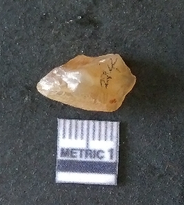 | Description / विवरण | The chalcedony flake is pale yellow in color. Translucent in appurtenance. The piece is shows sharp pointed ends and flake scars on the surface. As a result of flaking. |