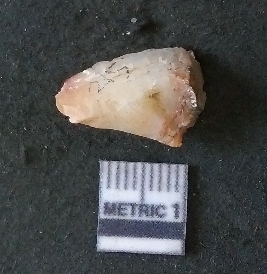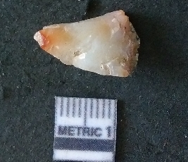 | Description / विवरण | The quartz fragment shows prominent flaks scars and sharp flaked ends as a result of flaking. The piece is translucent white and shows cryptocrystalline matrix. |