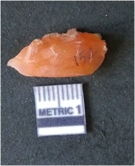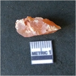 | Description / विवरण | It is carnelian flake red in color, with sharp flakes edges and a small bulb of percussion owing to knapping activity. The piece has sharp flaked edges and a crypto-crystalline matrix. |