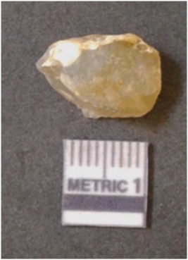 | Description / विवरण | It is chalcedony flake, translucent in appearance. The piece shows sharp pointed ends and flake scars on the surface as a result of flaking. The piece shows a bulb of percussion. |
