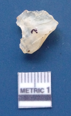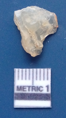 | Description / विवरण | It is a flake. The ridges and flake scars are clearly seen on the dorsal surface while the ventral surface is plain. The lateral sides are sharp and it is white in colour. |