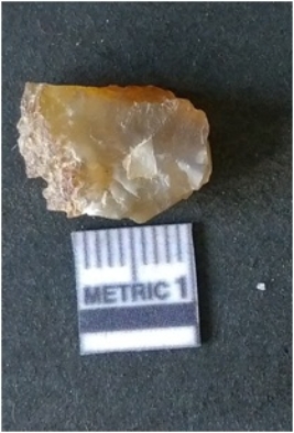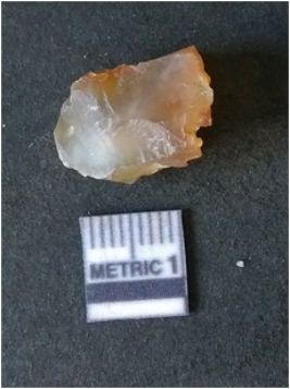 | Description / विवरण | It is chalcedony flake, translucent in appearance. The piece shows sharp pointed ends and flake scars on the surface as a result of flaking. The piece shows a bulb of percussion. |
