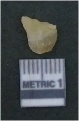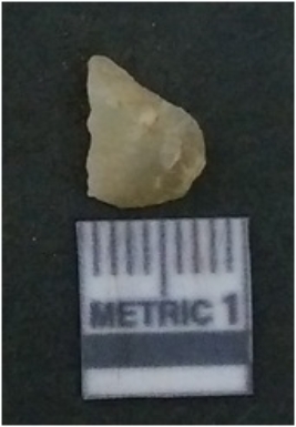 | Description / विवरण | It is chalcedony flake, translucent in appearance. The piece shows sharp pointed ends and flake scars on the surface as a result of flaking. The piece shows a bulb of percussion. |
