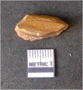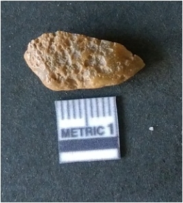 | Description / विवरण | The jasper fragment has sharp flaked edges and a bulb of percussion. The piece is dark in color and has crypto crystalline matrix. Flake scars are visible on the surface and bulb of percussion is present as a result of lithic knapping activity. |