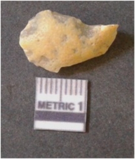 | Description / विवरण | The agate piece is translucent in appurtenance, with angular flaked edges and a bulb of percussion. The piece shows flake scars on the surface. |