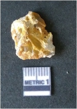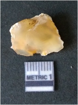 | Description / विवरण | It is chalcedony flake, translucent in appearance. The piece shows sharp pointed ends and flake scars on the surface as a result of flaking. The piece shows a bulb of percussion. |