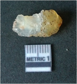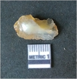 | Description / विवरण | It is chalcedony flake, translucent in appearance. The piece shows sharp pointed ends and flake scars on the surface as a result of flaking. The piece shows a bulb of percussion. |