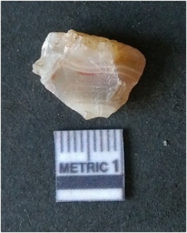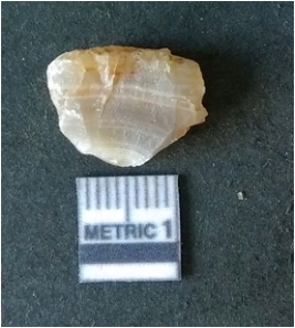 | Description / विवरण | It is chalcedony flake, translucent in appearance. The piece shows sharp pointed ends and flake scars on the surface as a result of flaking. The piece shows a bulb of percussion. |