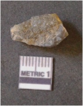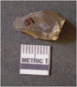 | Description / विवरण | The flake has irregular fracture pattern and sharp flaked edges as a result of lithic knapping activity. The piece is pale, with surfacial flake scars and a bulbous end. The flake is of smoky quartz variety, grayish in colour and translucent in appearance. |