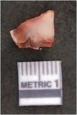 | Description / विवरण | It is carnelian flake red in color, with sharp flakes edges and a small bulb of percussion owing to knapping activity. The piece has sharp flaked edges and a crypto-crystalline matrix. |