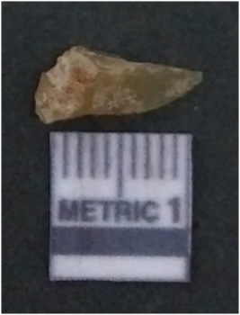 | Description / विवरण | It is chalcedony flake, translucent in appearance. The piece shows sharp pointed ends and flake scars on the surface as a result of flaking. The piece shows a bulb of percussion. |
