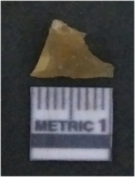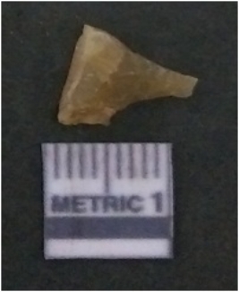 | Description / विवरण | It is chalcedony flake, translucent in appearance. The piece shows sharp pointed ends and flake scars on the surface as a result of flaking. The piece shows a bulb of percussion. |