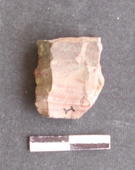 | Description / विवरण | It is chert fragment showing bands. Flaked scars on one side and other side shows bulb of percussion. |