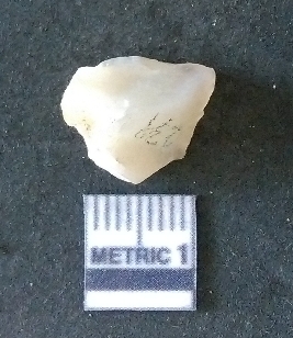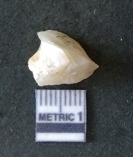 | Description / विवरण | The quartz fragment shows prominent flaks scars and sharp flaked ends as a result of flaking. The piece is translucent white and shows cryptocrystalline matrix. |
