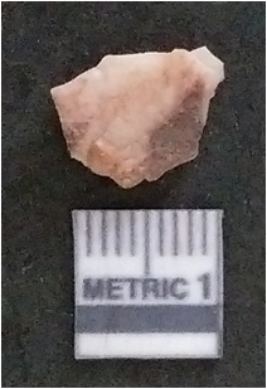 | Description / विवरण | The rosy quartz flake has sharp flaked edges and pointed ends as a result of flaking. The piece is semi-transparent in nature with irregular fracture pattern. The piece is roughly triangular in shape and has a prominent bulb of percussion. |