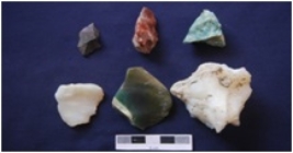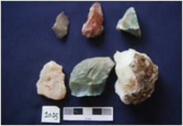 | Description / विवरण | Total No. of debitage 6. Flakes and Chunks with flake scars and one of the Green chert flake has a very prominent bulb of percussion, prepared platform, whereas the other with diffused bulb on ventral side. Chert 4 , Chalcedony 2 |