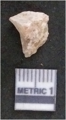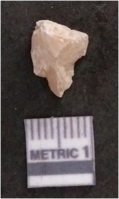 | Description / विवरण | The quartz flake has sharp flaked edges and pointed ends as a result of flaking. The piece is semi-transparent in nature with irregular fracture pattern. The piece is roughly triangular in shape and has a prominent bulb of percussion. |