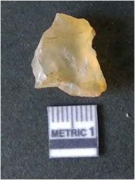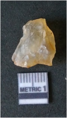 | Description / विवरण | It is chalcedony flake, translucent in appearance. The piece shows sharp pointed ends and flake scars on the surface as a result of flaking. The piece shows a bulb of percussion. |