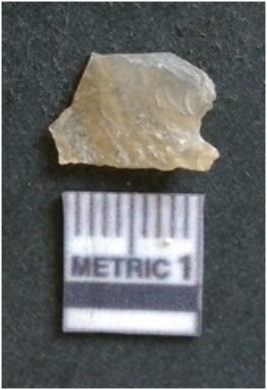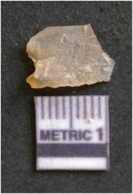 | Description / विवरण | It is chalcedony flake, translucent in appearance. The piece shows sharp pointed ends and flake scars on the surface as a result of flaking. The piece shows a bulb of percussion. |
