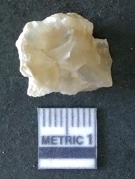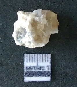 | Description / विवरण | The quartz fragment shows prominent flaks scars and sharp flaked ends as a result of flaking. The piece is translucent white and shows cryptocrystalline matrix. |