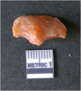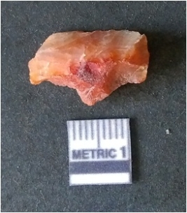 | Description / विवरण | It is carnelian flake red in color, with sharp flakes edges and a small bulb of percussion owing to knapping activity. The piece has sharp flaked edges and a crypto-crystalline matrix. |