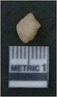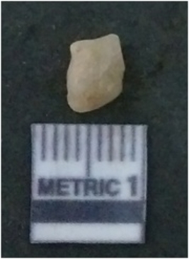 | Description / विवरण | The quartz flake has sharp flaked edges and pointed ends as a result of flaking. The piece is semi-transparent in nature with irregular fracture pattern. The piece is roughly triangular in shape and has a prominent bulb of percussion. |