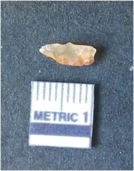 | Description / विवरण | It is chalcedony flake, translucent in appearance. The piece shows sharp pointed ends and flake scars on the surface as a result of flaking. The piece shows a bulb of percussion. |