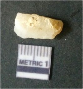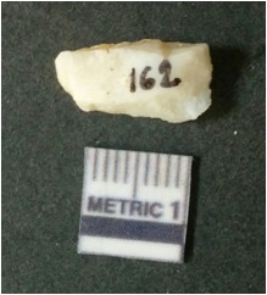 | Description / विवरण | The milky quartz flake has irregular fracture pattern and sharp flaked edges as a result of lithic knapping activity. The piece is pale, with surfacial flake scars and a bulbous end. The flake is white in color. |
