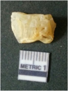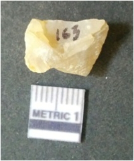| Description / विवरण | The milky quartz flake has irregular fracture pattern and sharp flaked edges as a result of lithic knapping activity. The piece is pale, with surfacial flake scars and a bulbous end. The flake is white in color. |