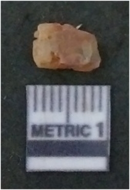 | Description / विवरण | The quartz flake has sharp flaked edges and pointed ends as a result of flaking. The piece is semi-transparent in nature with irregular fracture pattern. The piece is roughly triangular in shape and has a prominent bulb of percussion. |