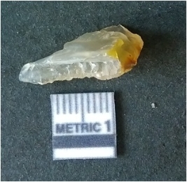 | Description / विवरण | It is chalcedony flake, translucent in appearance. The piece shows sharp pointed ends and flake scars on the surface as a result of flaking. The piece shows a bulb of percussion. |