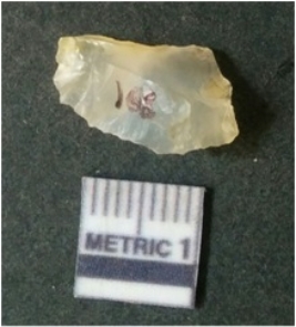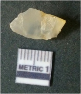 | Description / विवरण | The quartz flake has sharp flaked edges and pointed ends as a result of flaking. The piece is semi-transparent in nature with irregular fracture pattern. The piece is roughly triangular in shape and has a prominent bulb of percussion. |