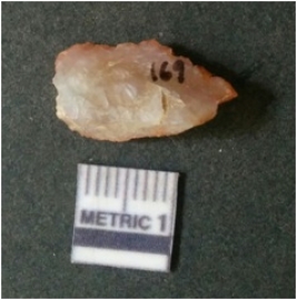 | Description / विवरण | The flake has irregular fracture pattern and sharp flaked edges as a result of lithic knapping activity. The piece is pale, with surfacial flake scars and a bulbous end. The quartz flake is rosy white in colour. |