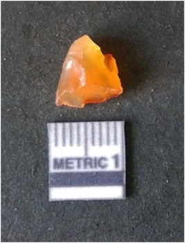 | Description / विवरण | It is carnelian flake red in color, with sharp flakes edges and a small bulb of percussion owing to knapping activity. The piece has sharp flaked edges and a crypto-crystalline matrix. |