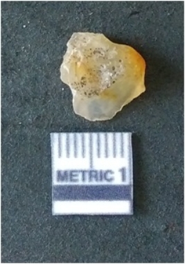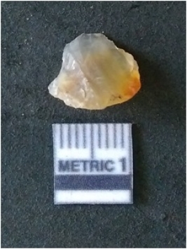 | Description / विवरण | It is chalcedony flake, translucent in appearance. The piece shows sharp pointed ends and flake scars on the surface as a result of flaking. The piece shows a bulb of percussion. |