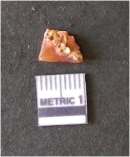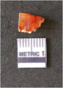 | Description / विवरण | It is carnelian flake red in color, with sharp flakes edges and a small bulb of percussion owing to knapping activity. The piece has sharp flaked edges and a crypto-crystalline matrix. |
