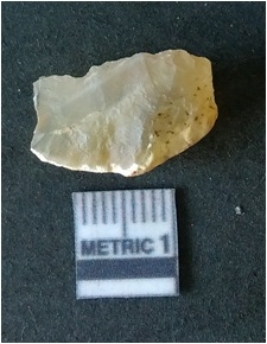| Description / विवरण | It is chalcedony flake, translucent in appearance. The piece shows sharp pointed ends and flake scars on the surface as a result of flaking. The piece shows a bulb of percussion. |