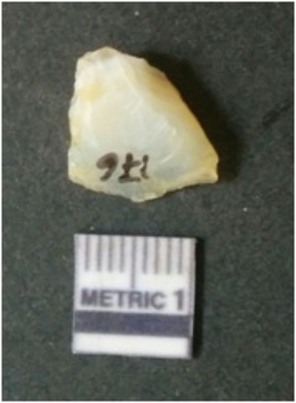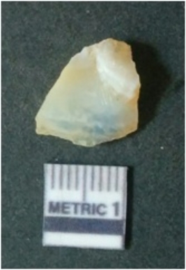 | Description / विवरण | The quartz flake has sharp flaked edges and pointed ends as a result of flaking. The piece is semi-transparent in nature with irregular fracture pattern. The piece is roughly triangular in shape and has a prominent bulb of percussion. |
