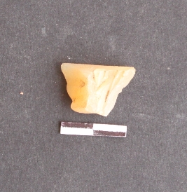 | Description / विवरण | It is a chalcedony stone with bulb of percussion prominent on one surface and flaked un even ridges on the other side, translucent with cut edges. |
