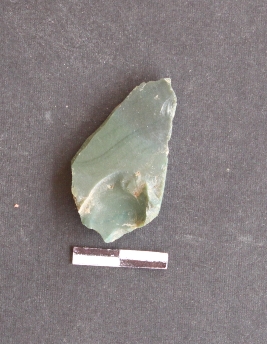 | Description / विवरण | Chert stone fragment, elongated with bulb of percussion seen with a striking platform, cut ridges. Dark greenish in color. |