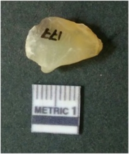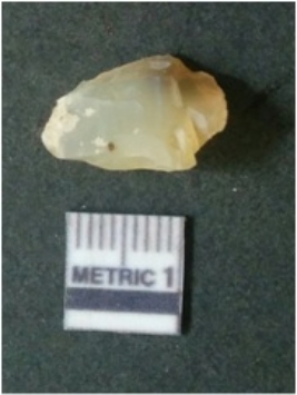 | Description / विवरण | The quartz flake has sharp flaked edges and pointed ends as a result of flaking. The piece is semi-transparent in nature with irregular fracture pattern. The piece is roughly triangular in shape and has a prominent bulb of percussion. |