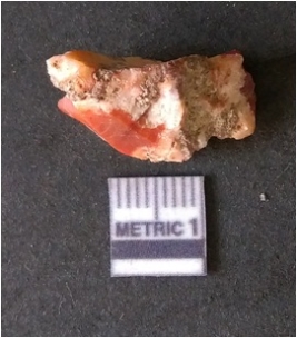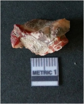 | Description / विवरण | It is carnelian flake red in color, with sharp flakes edges and a small bulb of percussion owing to knapping activity. The piece has sharp flaked edges and a crypto-crystalline matrix. |